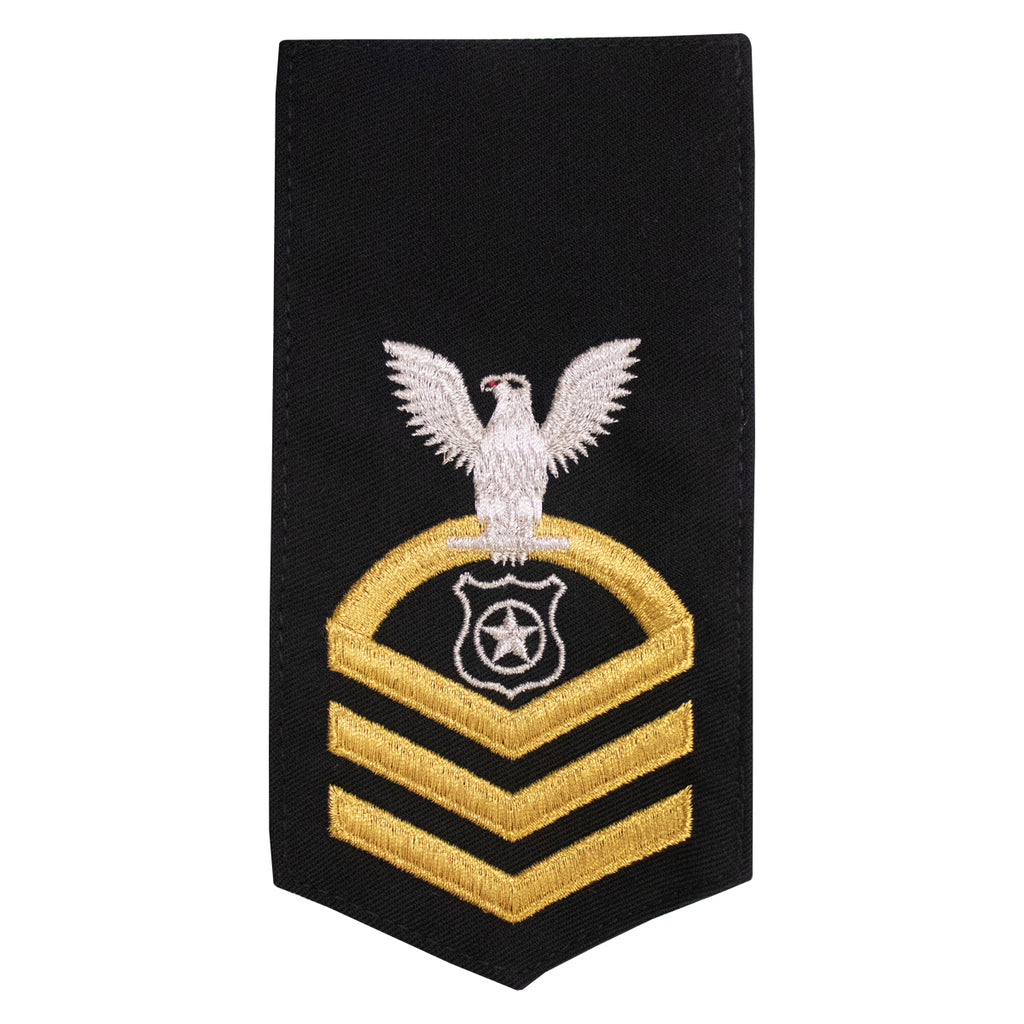 Navy rating badge E-7 seaworthy-all machine made eagle and center with embroidered gold embroidered on blue MA Master at Arms
