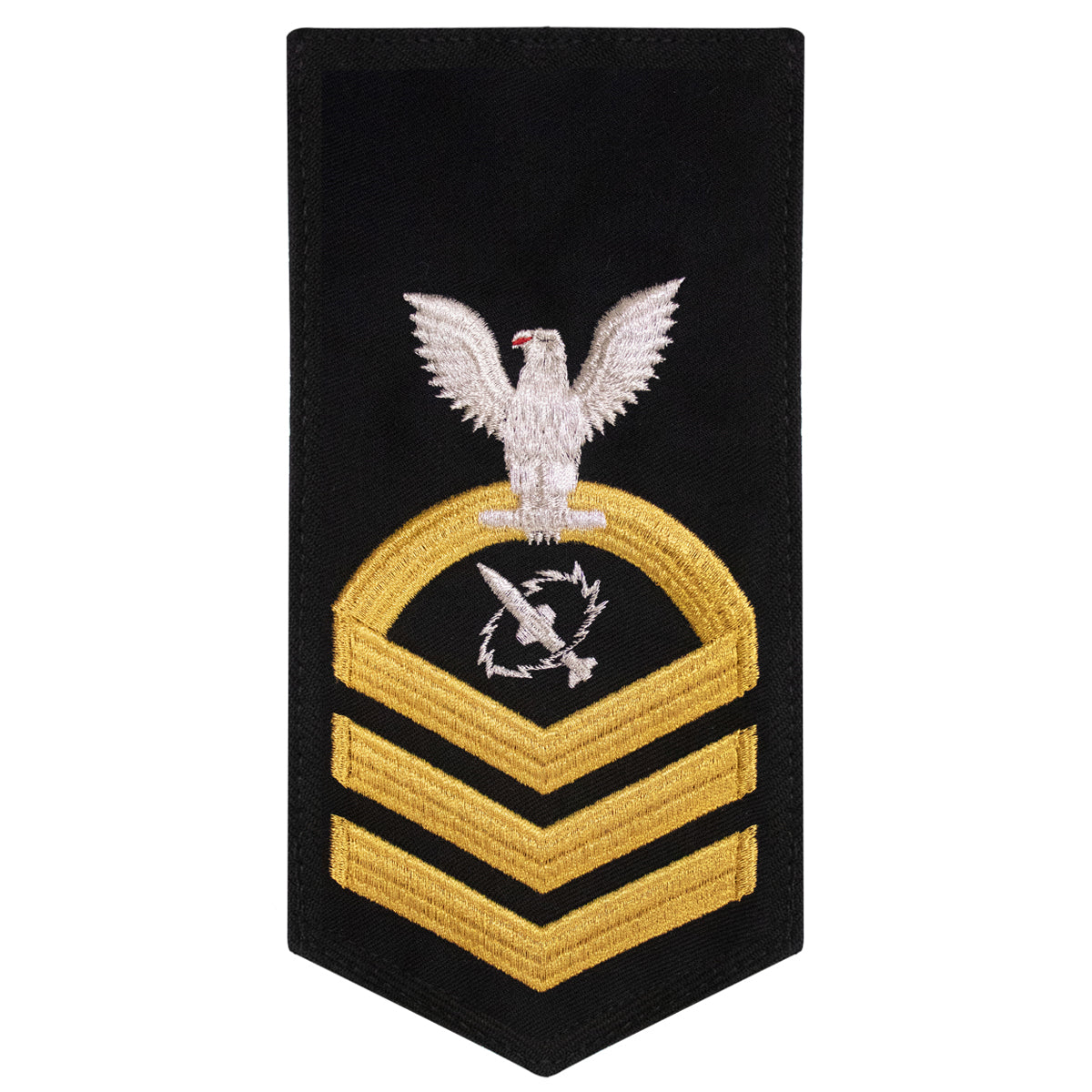 Navy rating badge E-7 seaworthy-all machine made eagle and center with embroidered gold embroidered on blue (MT) Missile Technician.