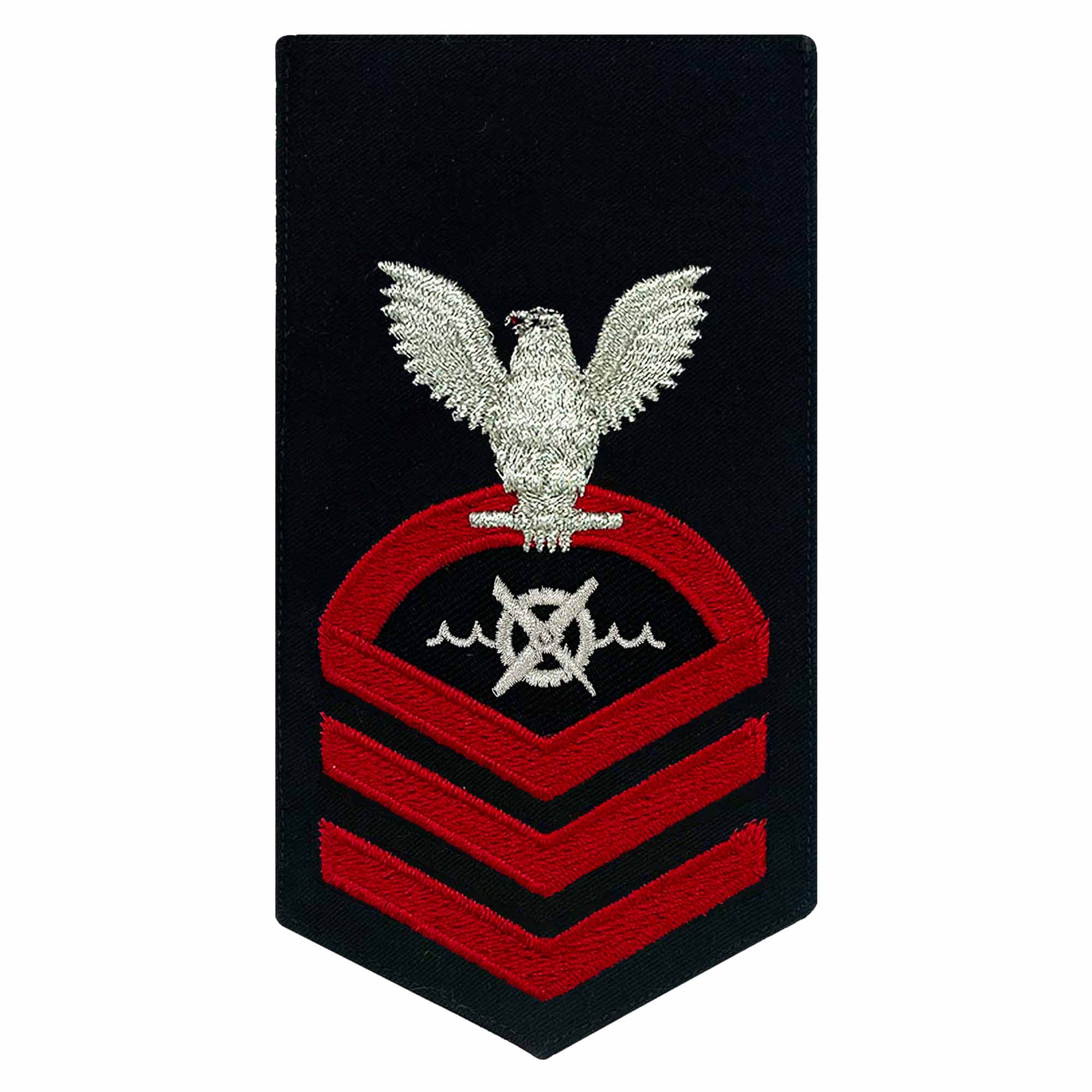 Navy rating badge E-7 seaworthy embroidered eagle and center with red chevrons on blue RW Robotics Warfare Specialist - individually priced.