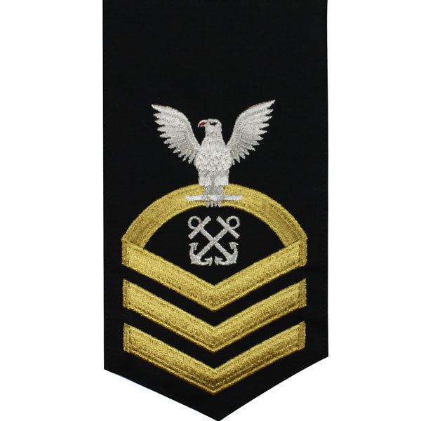 Navy rating badge E-7 seaworthy-all machine made eagle and center with embroidered gold embroidered on blue (BM) Boatswains Mate.