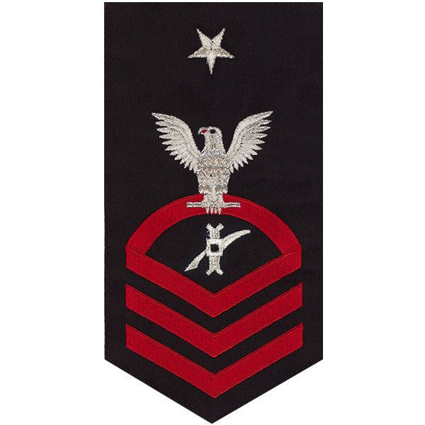 Navy rating badge E-8 seaworthy embroidered eagle and center with red chevrons on blue LN Legalman - individually priced.