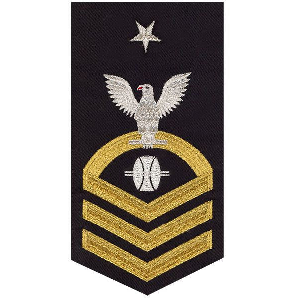 Navy rating badge E-8 seaworthy-all machine made eagle and center with embroidered gold embroidered on blue Opticalman (OM) - individually priced.