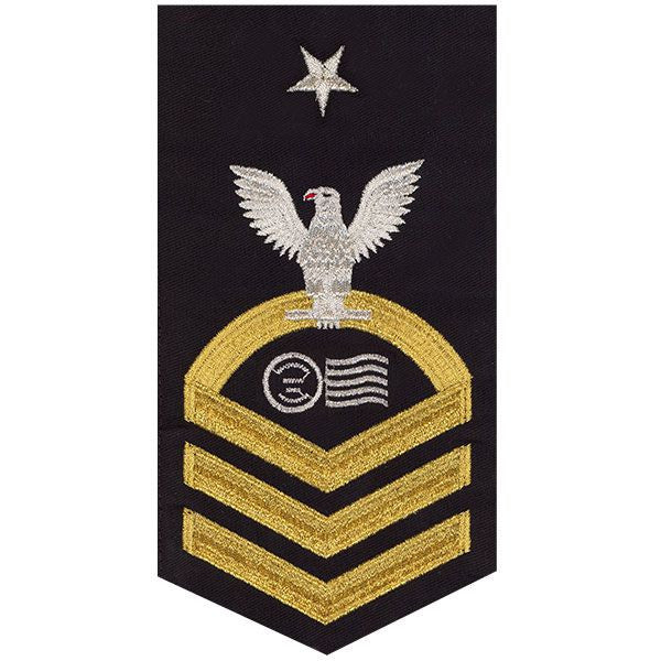 Navy rating badge E-8 seaworthy-all machine made eagle and center with embroidered gold embroidered on blue Postal Clerk (PC) - individually priced.