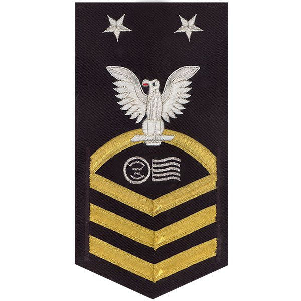 Navy rating badge E-9 seaworthy-all machine made eagle and center with embroidered gold embroidered on blue Postal Clerk (PC) - individually priced.