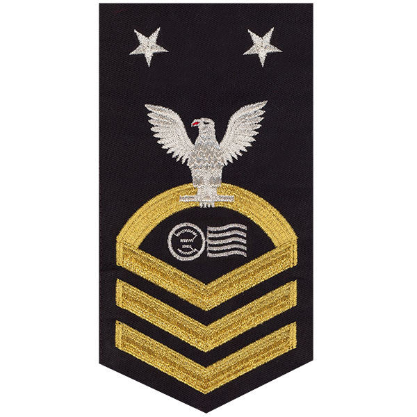 Navy rating badge E-9 Vanchief silver eagle with gold lace chevrons on blue Postal Clerk (PC) - individually priced. Please allow 2-4 weeks for delivery.