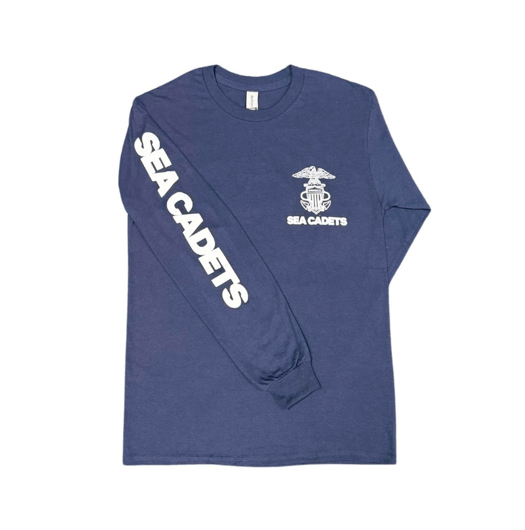 NEW! Long Sleeve navy blue t-shirt with with white screen printed Sea Cadet logo on the front and back. White screen printed "Sea Cadet" on right sleeve.