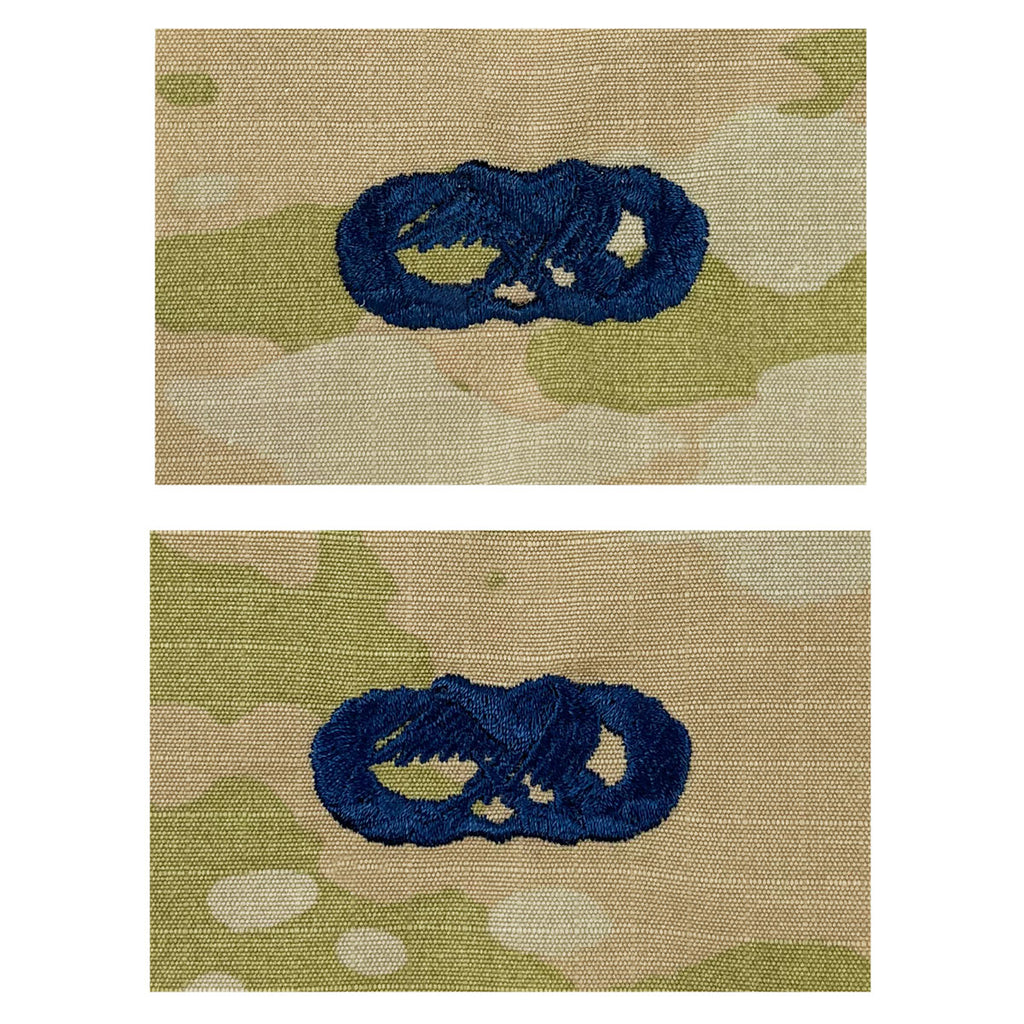 Space Force OCP uniform Maintenance badge embroidered. Enlisted wear the basic badge after award of the 5-skill level, the senior badge after award of the 7-skill level and the master badge after award of the 9-skill level.