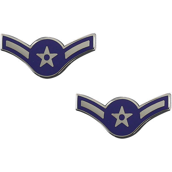 Air Force chevron metal airman.1 silver stripe with silver star and on blue enamel.