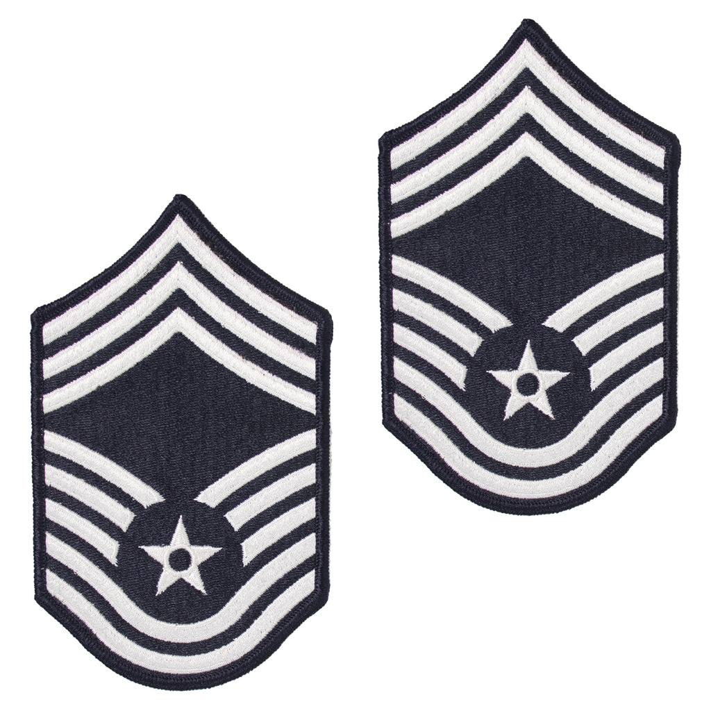 Air Force chevron small size full color blue embroidered chief master sergeant. 8 stripes with star in center white on blue, 3½ inches wide. Price per pair.