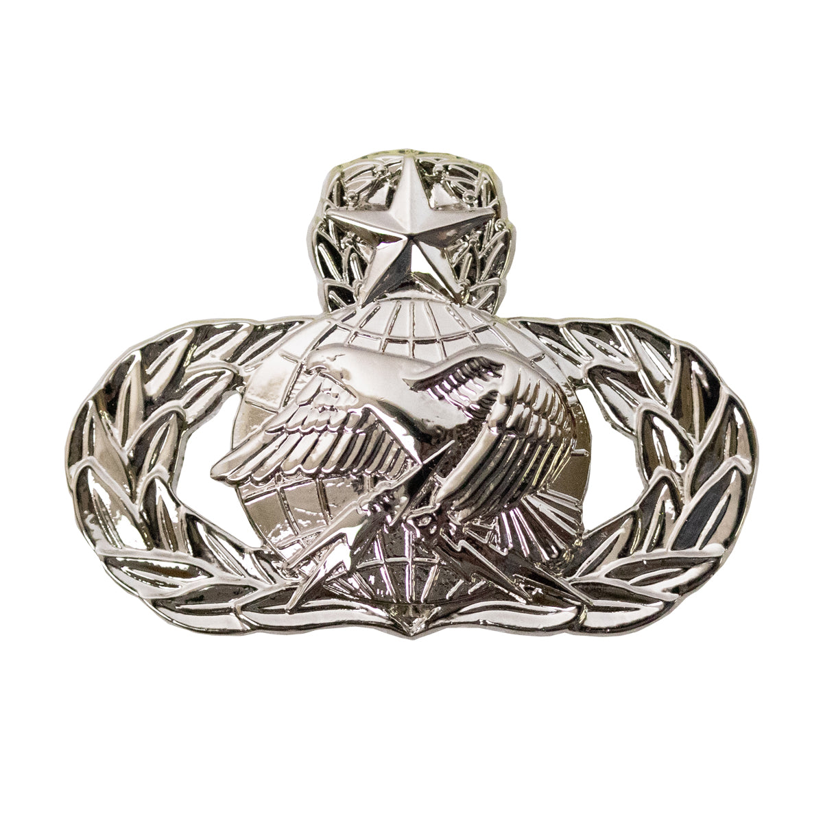 Air Force badge mid-size mirror finish Master Logistics. Master badge is awarded after 15 years for officers and to E-7s or above who have performed at the craftsman skill level for at least 5 years.