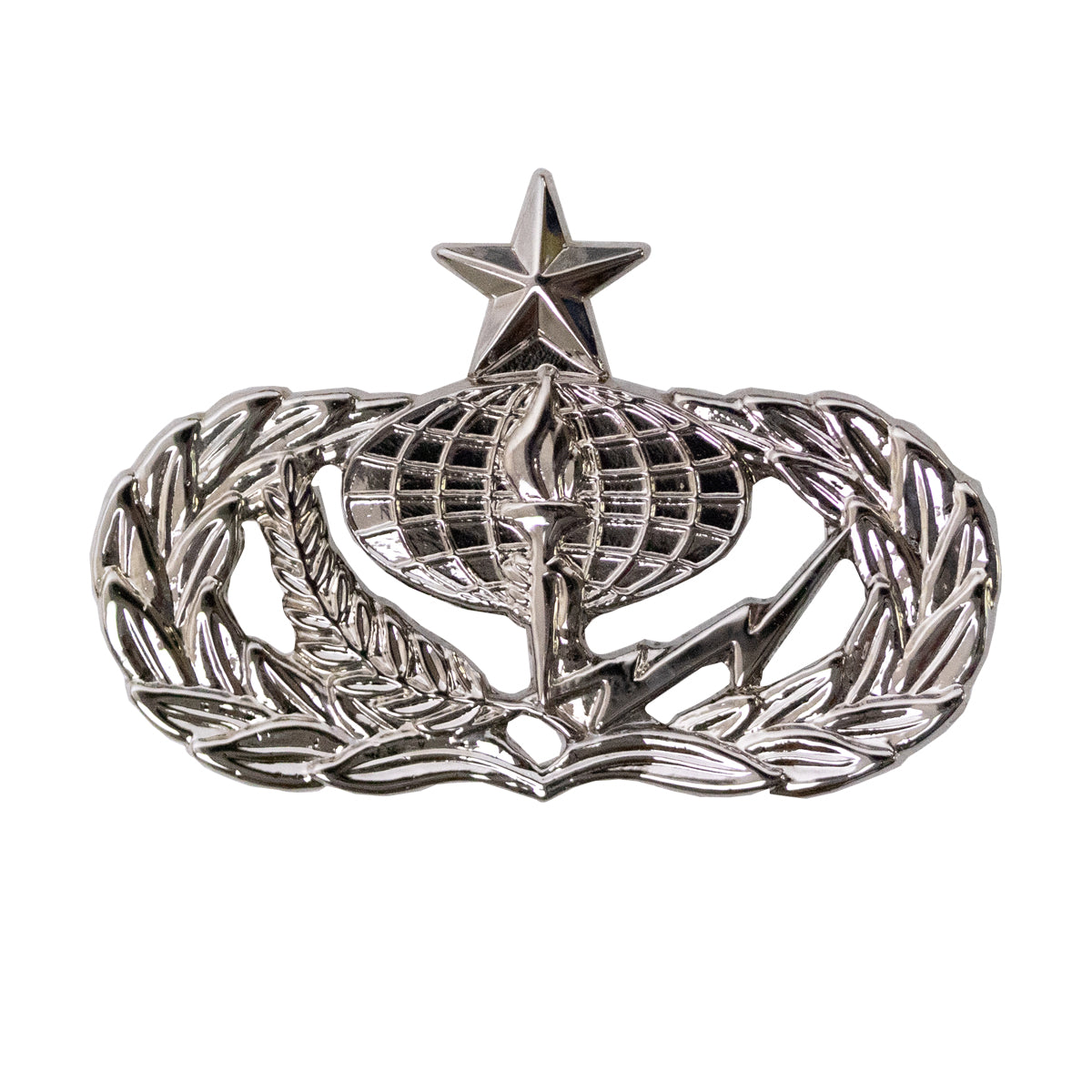 Air Force badge mid-size mirror finish senior services. Authorized in 1993 and awarded to both officers and enlisted personnel in the commissary service career field.