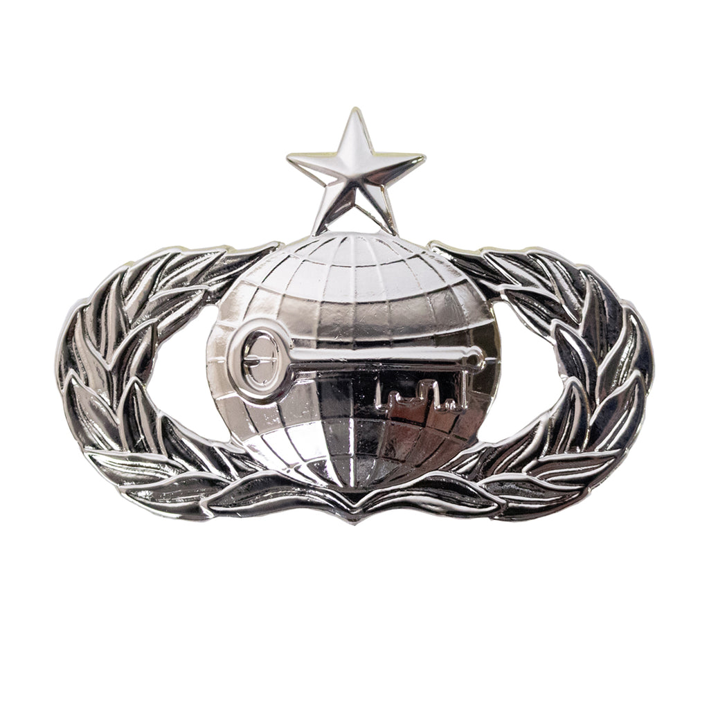 Air Force badge regulation mirror finish Senior Intelligence. Authorized in 1993 and awarded to both officers and enlisted personnel in the intelligence career field.