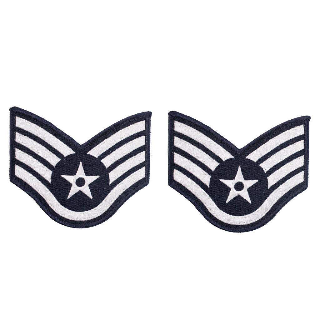Air Force chevron large size full color blue embroidered Staff Sergeant.4 stripes with star in center white on blue, 4 inches wide.