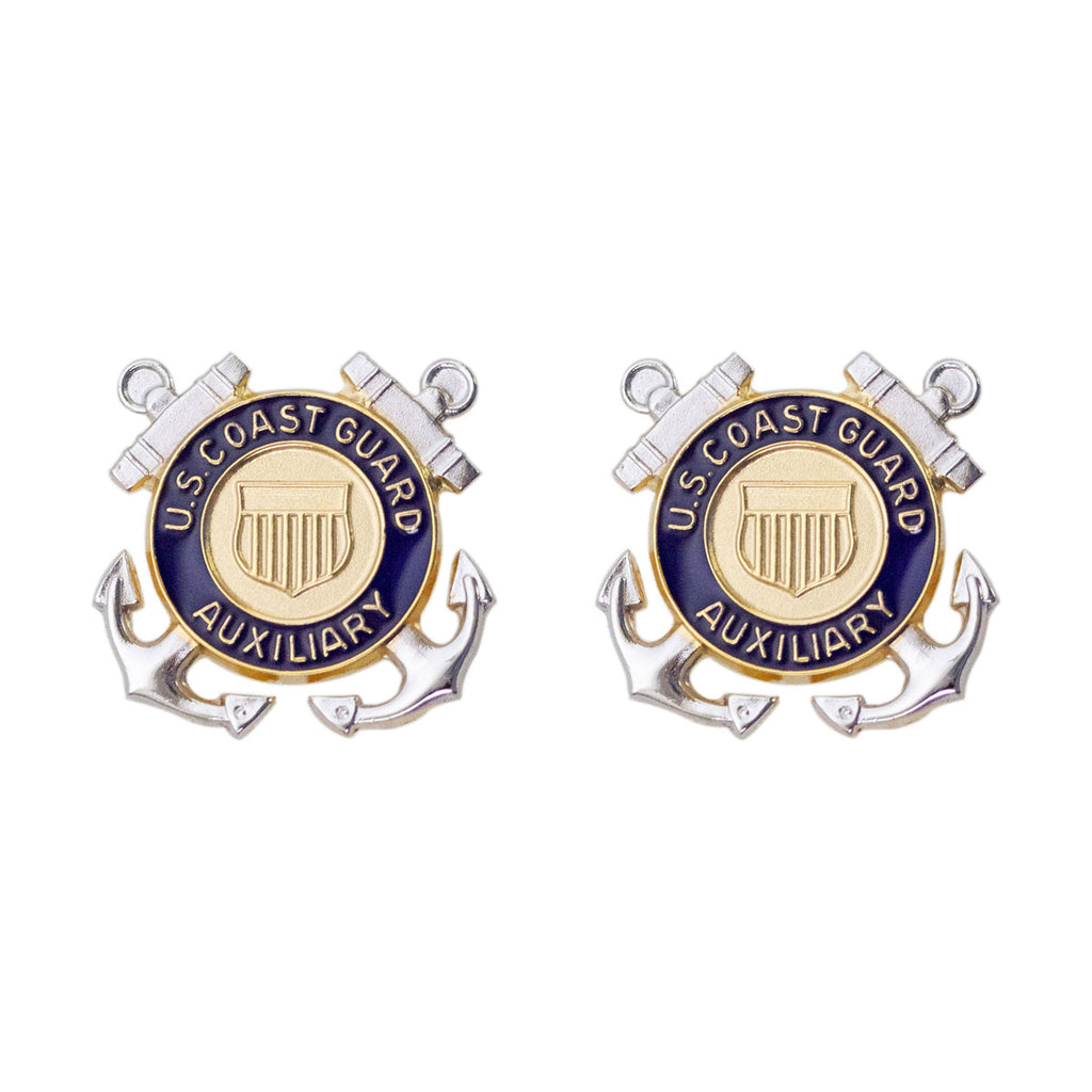 Coast Guard (USCG) Auxiliary Collar Device Member - Silver & Blue Shield w/Crossed Anchor. Priced per pair.