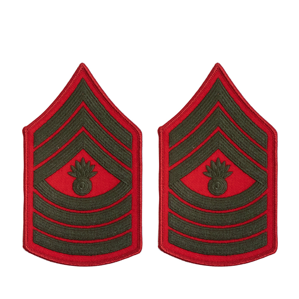 United States Marine Corps (USMC) Chevron female green embroidered on red Master Gunnery Sergeant (MGYSGT) new style. Priced per pair.