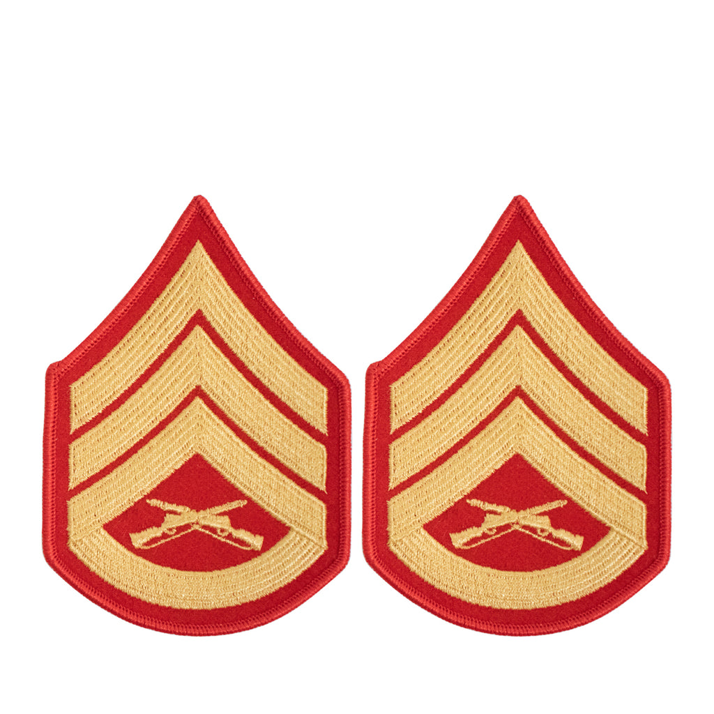 United States Marine Corps (USMC) Chevron female gold embroidered on red Staff Sergeant (SSGT) new style. Priced per pair.