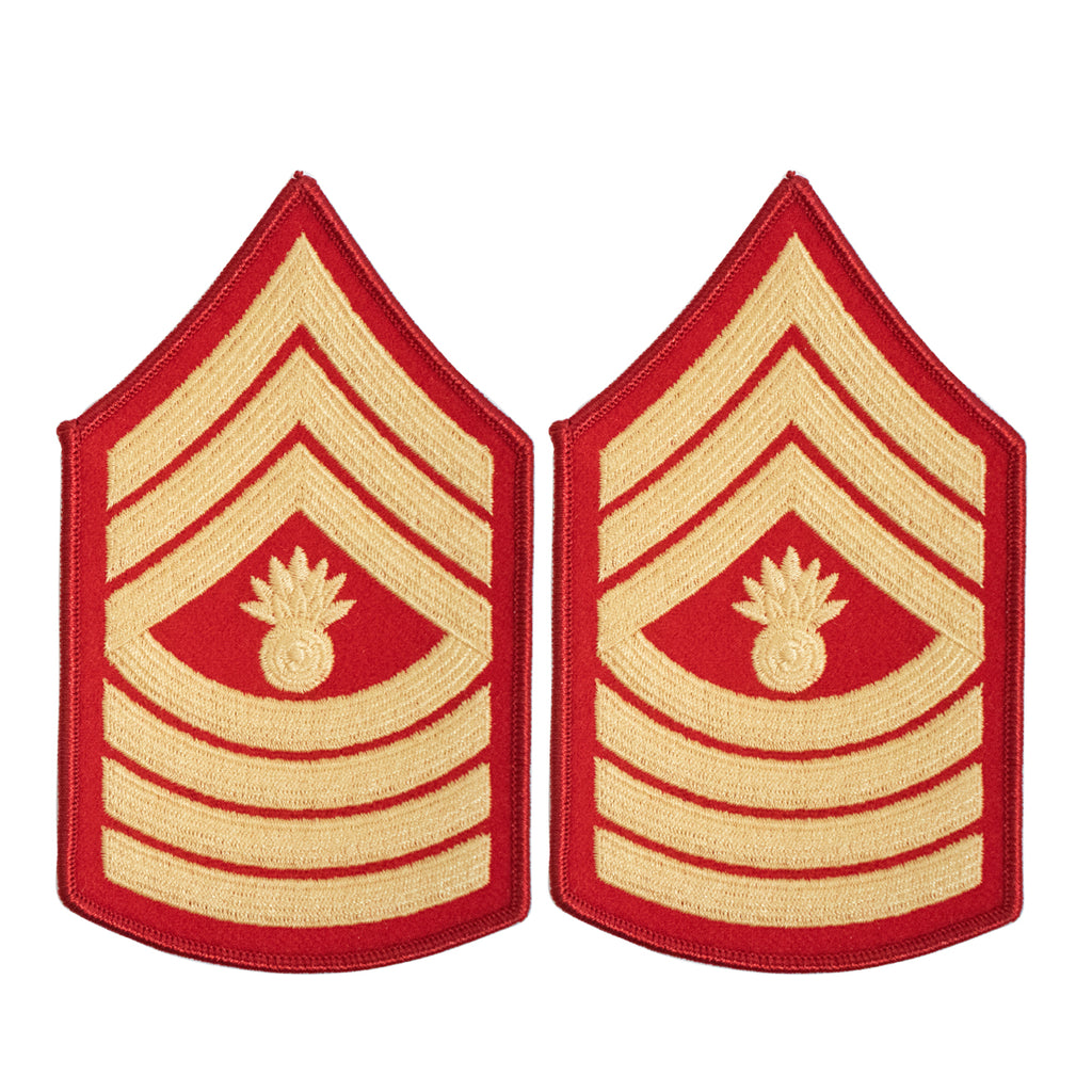 United States Marine Corps (USMC) Chevron female gold embroidered on red Master Gunnery Sergeant (MGYSGT) new style. Priced per pair.