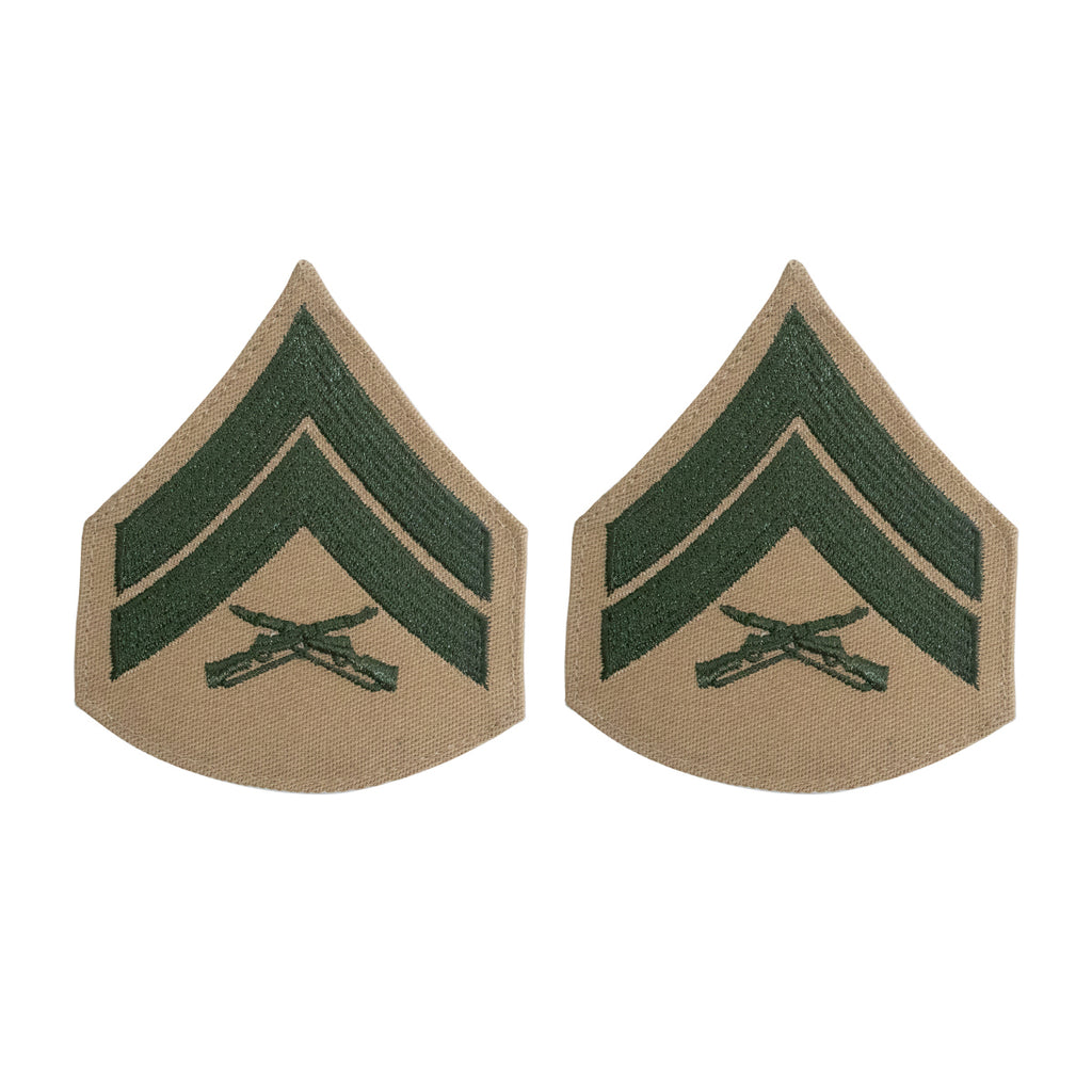 United States Marine Corps (USMC) Chevron female green embroidered on khaki Corporal (CPL) new style. Priced per pair.