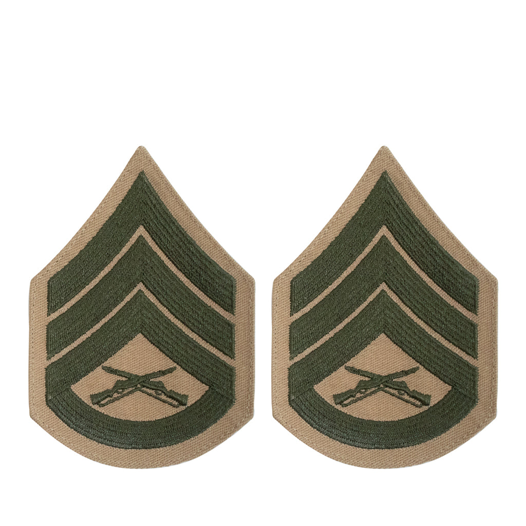 United States Marine Corps (USMC) Chevron female green embroidered on khaki Staff Sergeant (SSGT) new style. Priced per pair.