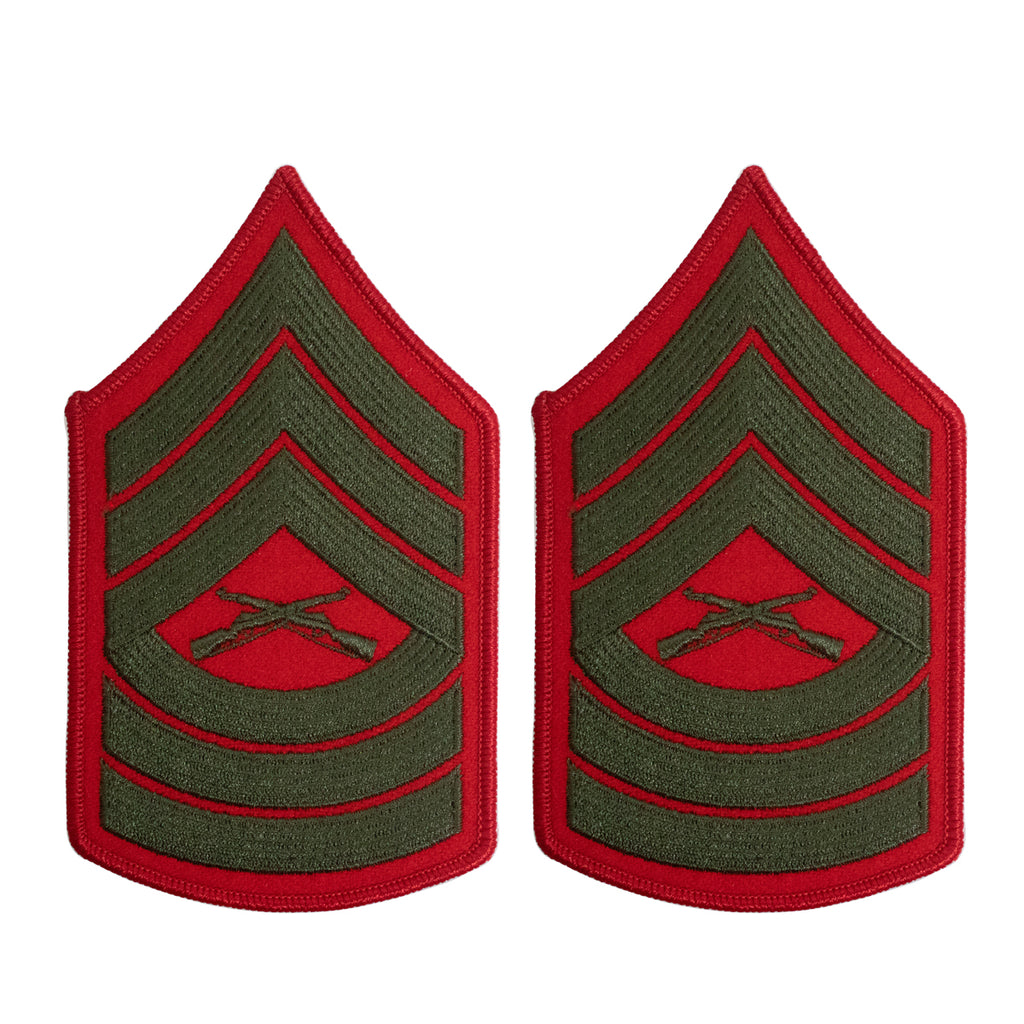 United States Marine Corps (USMC) Chevron female green embroidered on red Master Sergeant (MSGT) new style. Priced per pair.