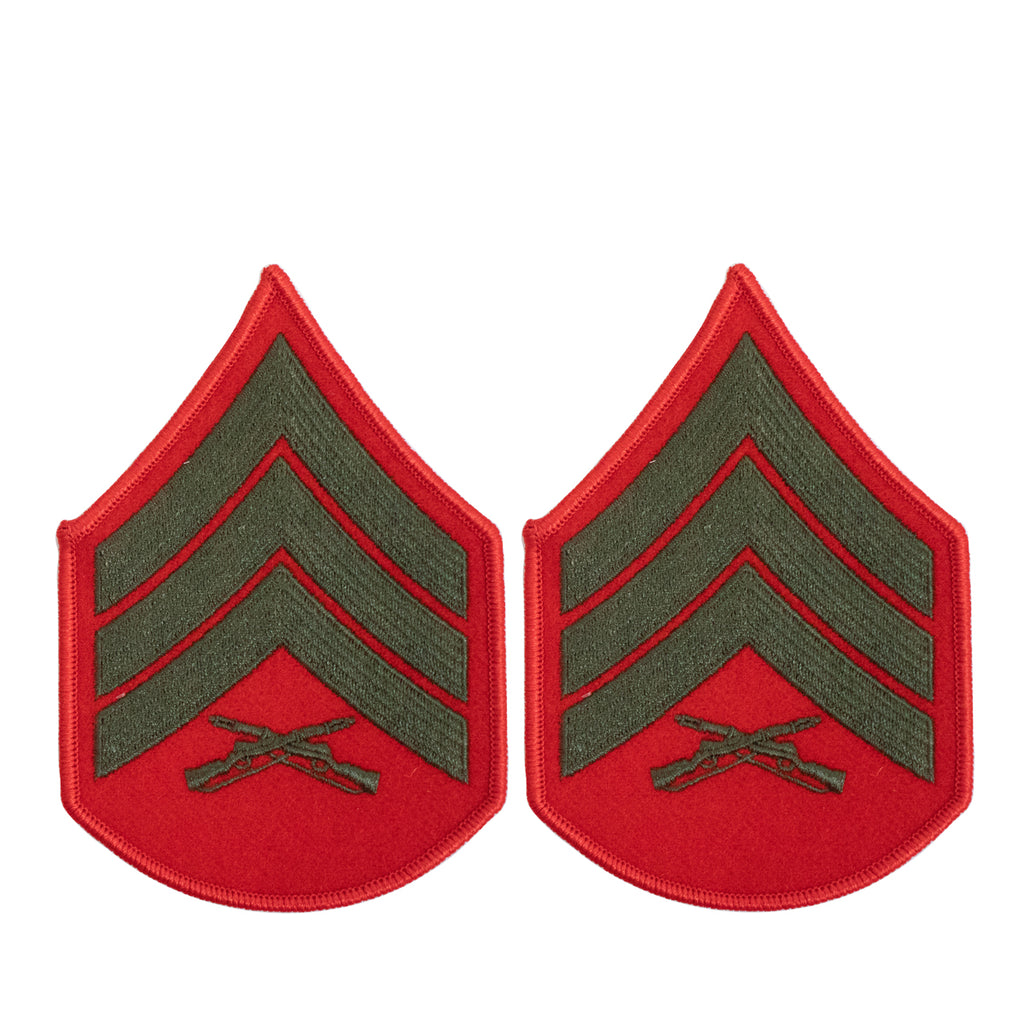 United States Marine Corps (USMC) Chevron female green embroidered on red Sergeant (SGT) new style. Priced per pair.