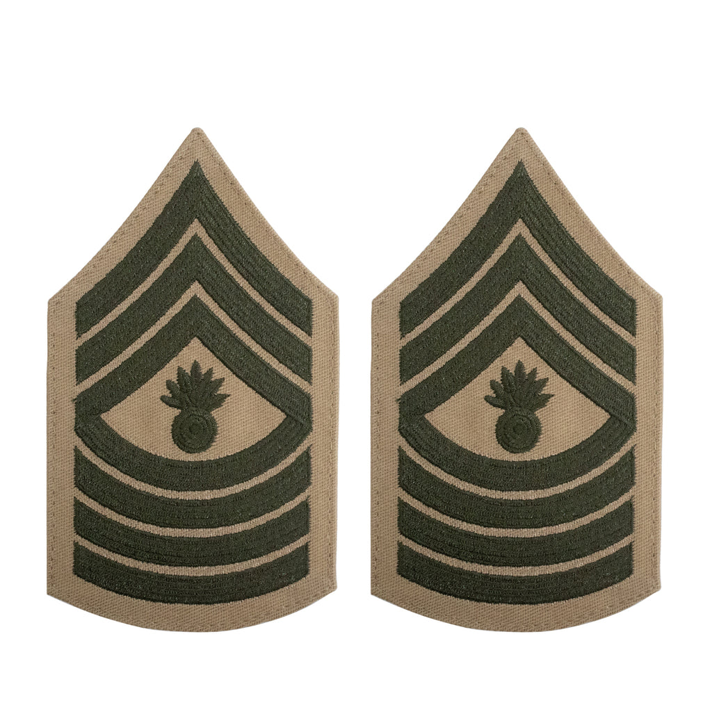 United States Marine Corps (USMC) Chevron female green embroidered on khaki Master Gunnery Sergeant (MGYSGT) new style. Priced per pair.