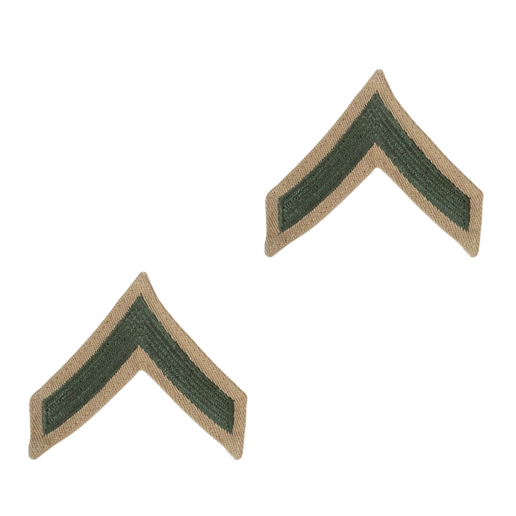 United States Marine Corps (USMC) Chevron female green embroidered on khaki Private 1st class (PFC) new style. Priced per pair.