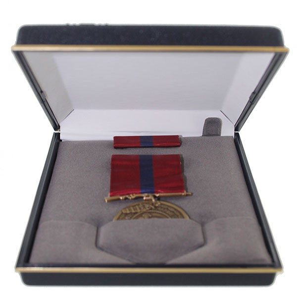 Full size medal presentation set for the Marine Corps Good Conduct award. The set includes a full size medal and ribbon unit mounted on a single base bar with clutch backs in a presentation case. Priced per set.  Please allow an additional 7-10 days for production.