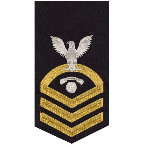 Navy rating badge E-7 seaworthy-all machine made eagle and center with embroidered gold embroidered on blue ic inter communication electrician.