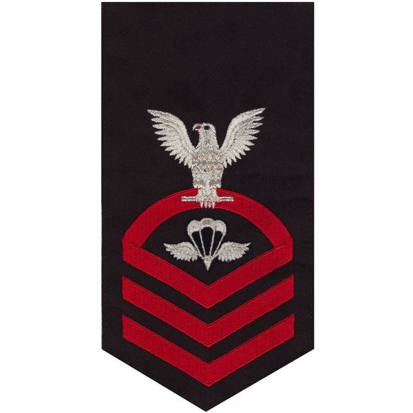 Navy rating badge E-7 seaworthy embroidered eagle and center with red chevrons on blue (PR) aircrew survival equipmentman - individually priced.