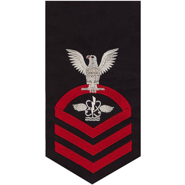 Navy rating badge E-7 seaworthy embroidered eagle and center with red chevrons on blue (AW) aviation antisub warfare operator - individually priced.