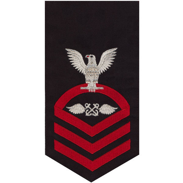 Navy rating badge E-7 seaworthy embroidered eagle and center with red chevrons on blue (AB) aviation boatswain - individually priced.
