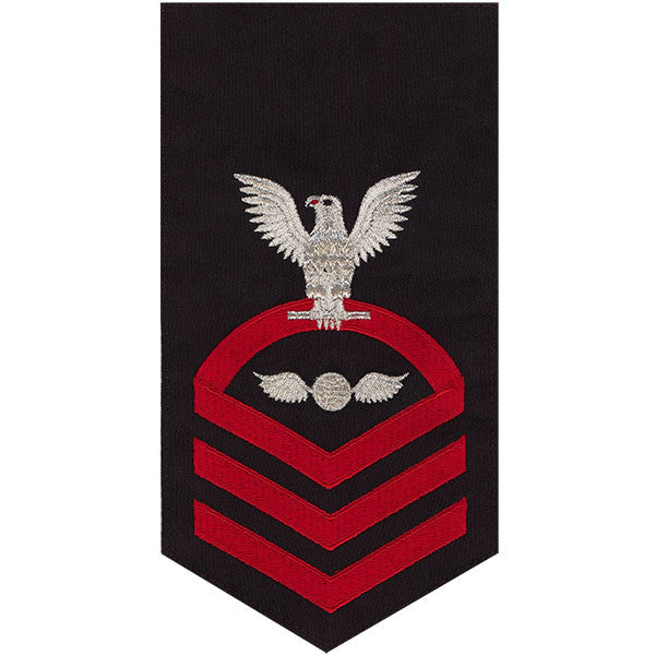 Navy rating badge E-7 seaworthy embroidered eagle and center with red chevrons on blue (AE) aviation electrician - individually priced.