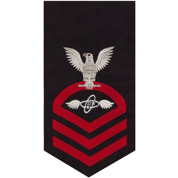 Navy rating badge E-7 seaworthy embroidered eagle and center with red chevrons on blue (AT) aviation electronic technician - individually priced.