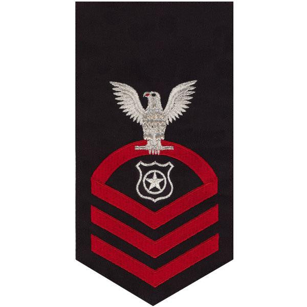 Navy rating badge E-7 seaworthy embroidered eagle and center with red chevrons on blue: master-at-arms (AT) - individually priced.
