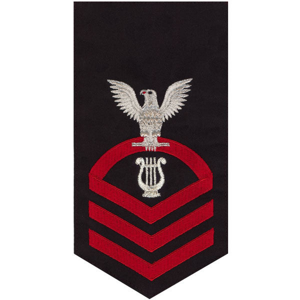 Navy rating badge E-7 seaworthy embroidered eagle and center with red chevrons on blue Musician (MU) - individually priced.