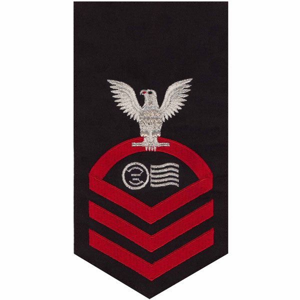 Navy rating badge E-7 seaworthy embroidered eagle and center with red chevrons on blue (PC)postal clerk - individually priced (inactive duty item).
