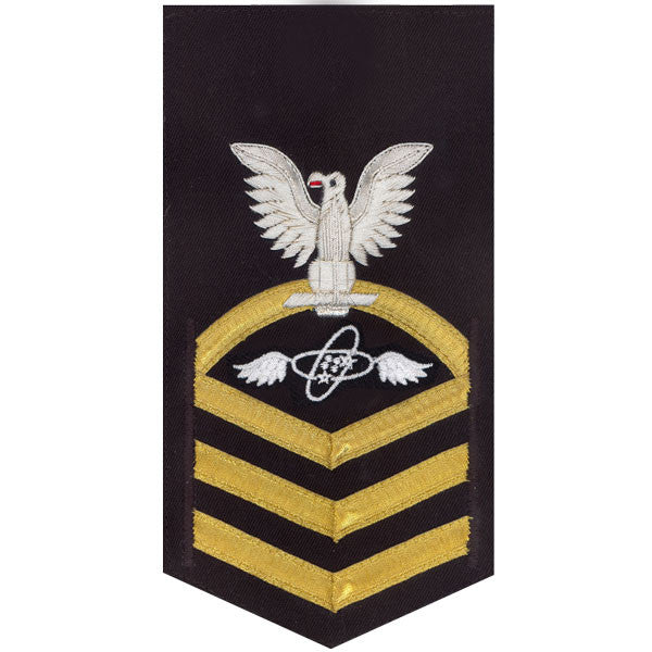Navy rating badge E-7 Vanchief silver eagle with gold lace chevrons on blue (AT) aviation electronics - individually priced. Please allow 2-4 weeks for delivery.