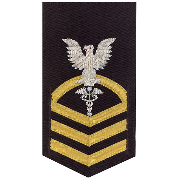 Navy rating badge E-7 Vanfine bullion eagle and center with gold lace chevrons on blue hm hospital corpsman - individually priced. Please allow 2-4 weeks for delivery.