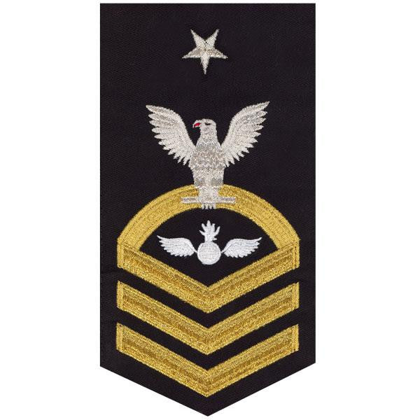 Navy rating badge E-8 seaworthy-all machine made eagle and center with embroidered gold embroidered on blue (AO) aviation ordnance.