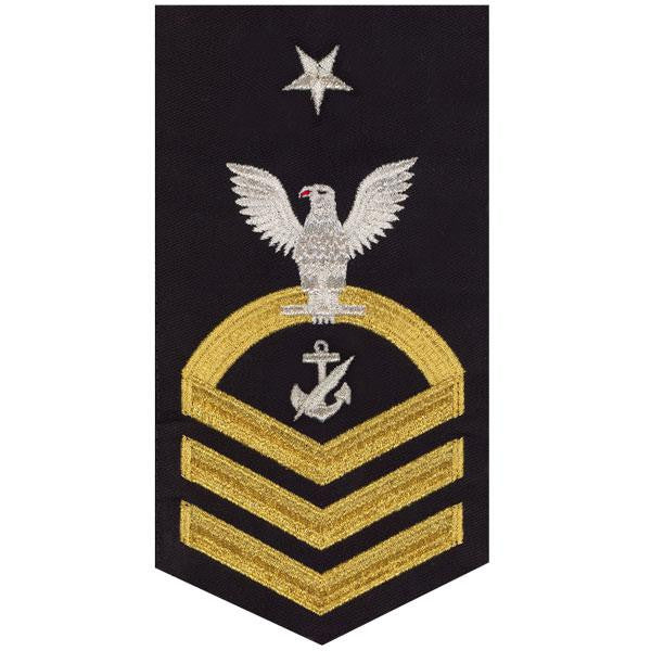Navy rating badge E-8 seaworthy-all machine made eagle and center with embroidered gold embroidered on blue Navy Counselor (NC).