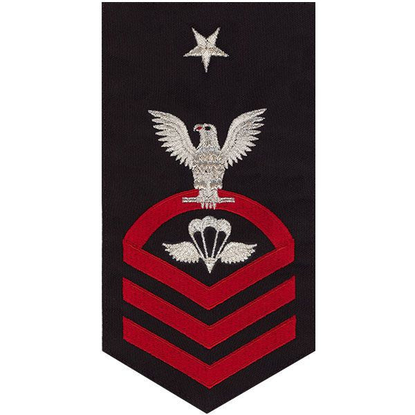 Navy rating badge E-8 seaworthy embroidered eagle and center with red chevrons on blue (PR) aircrew survival equipmentman- individually priced.