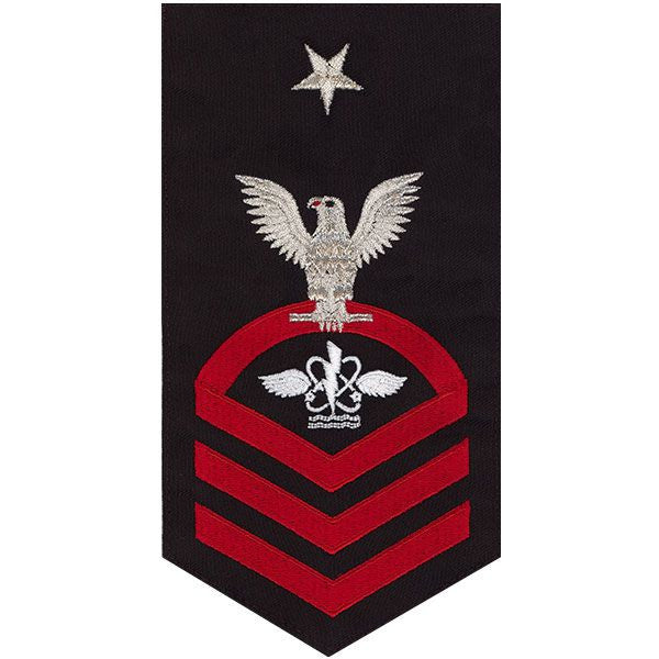 Navy rating badge E-8 seaworthy embroidered eagle and center with red chevrons on blue (AW) aviation antisub warfare operator - individually priced.