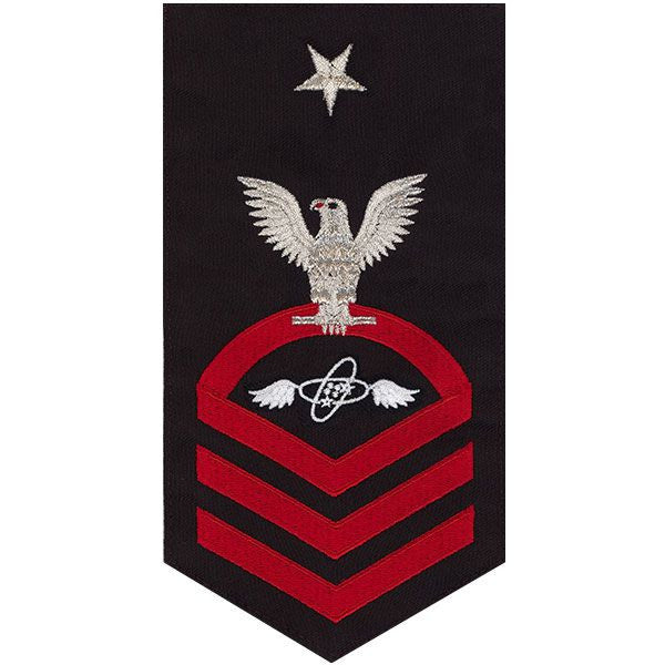Navy rating badge E-8 seaworthy embroidered eagle and center with red chevrons on blue (AT) aviation electronic technician - individually priced.