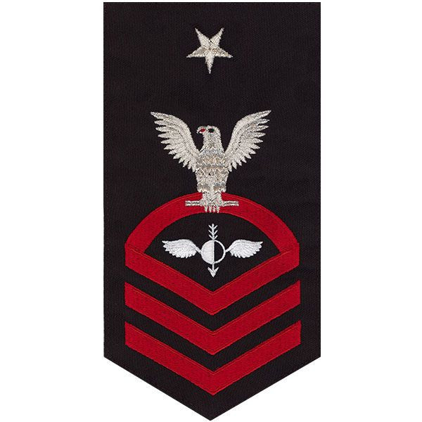 Navy rating badge E-8 seaworthy embroidered eagle and center with red chevrons on blue (AG)aerographer - individually priced.