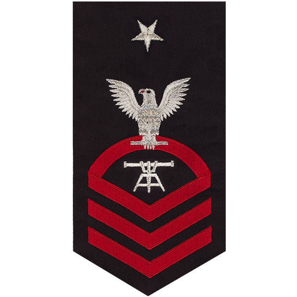 Navy rating badge E-8 seaworthy embroidered eagle and center with red chevrons on blue ft fire control technician - individually priced.