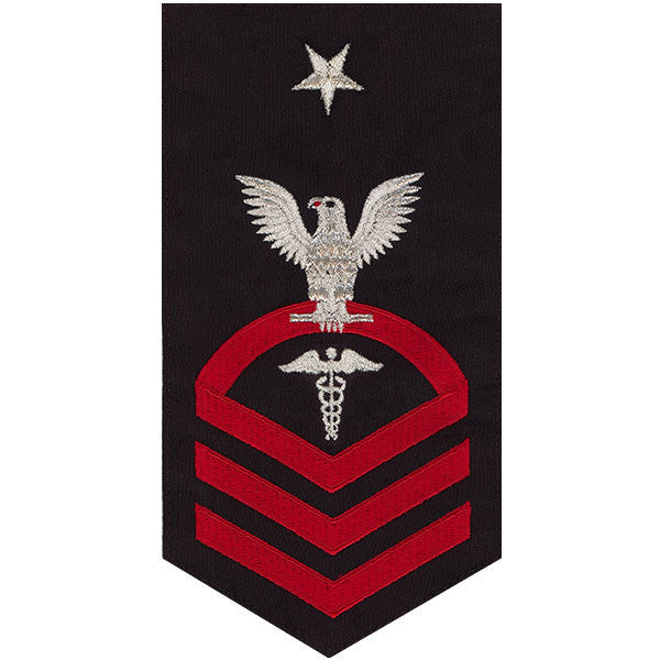Navy rating badge E-8 seaworthy embroidered eagle and center with red chevrons on blue hm hospital corpsman- individually priced.