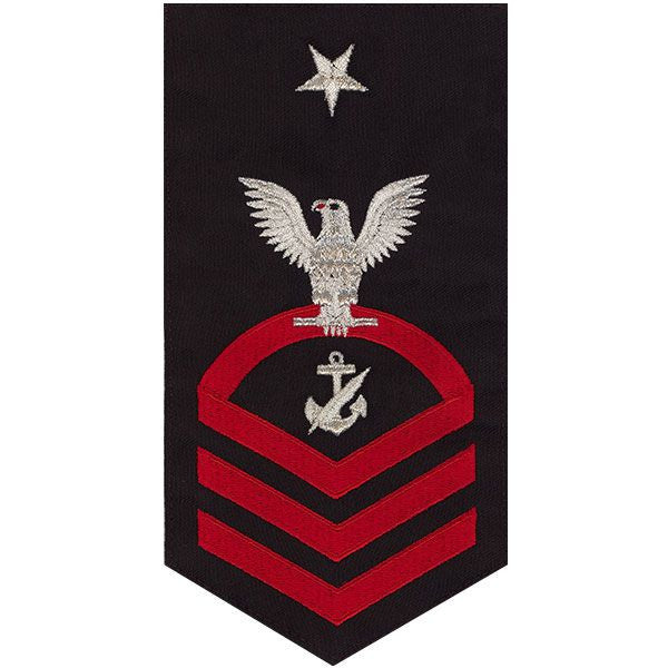 Navy rating badge E-8 seaworthy embroidered eagle and center with red chevrons on blue Navy Counselor (NC) - individually priced.