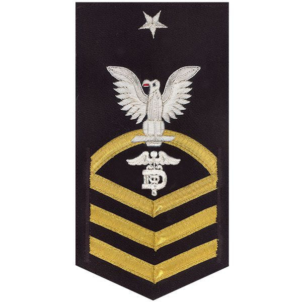 Navy rating badge E-8 Vanchief silver eagle with gold lace chevrons on blue (DT) dental technician - individually priced (inactive duty item). Please allow 2-4 weeks for delivery.