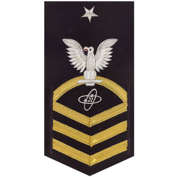 Navy rating badge E-8 Vanchief silver eagle with gold lace chevrons on blue et electronics technician - individually priced. Please allow 2-4 weeks for delivery.